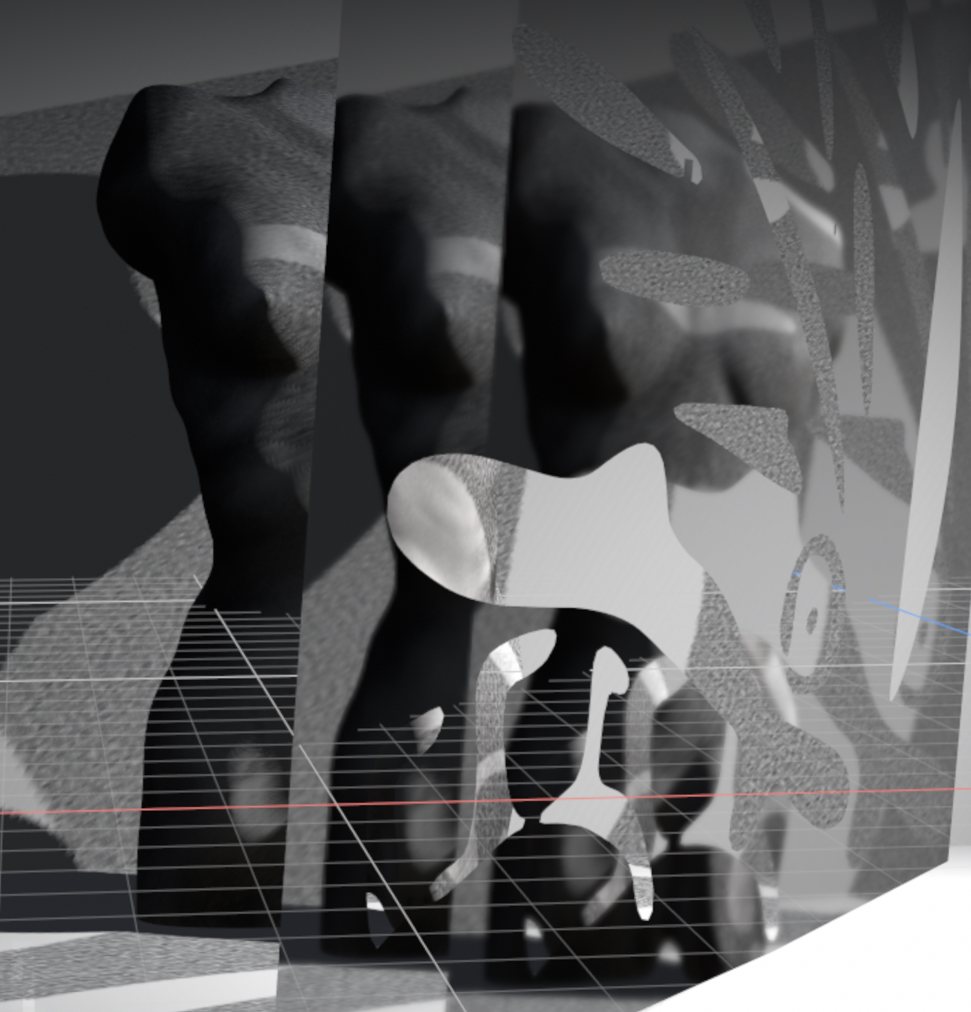 The process begins with a physical form from clay, which is then 3D scanned and digitally sculpted. Glitches act as chance operations, and the artist responds through physical observational drawing.